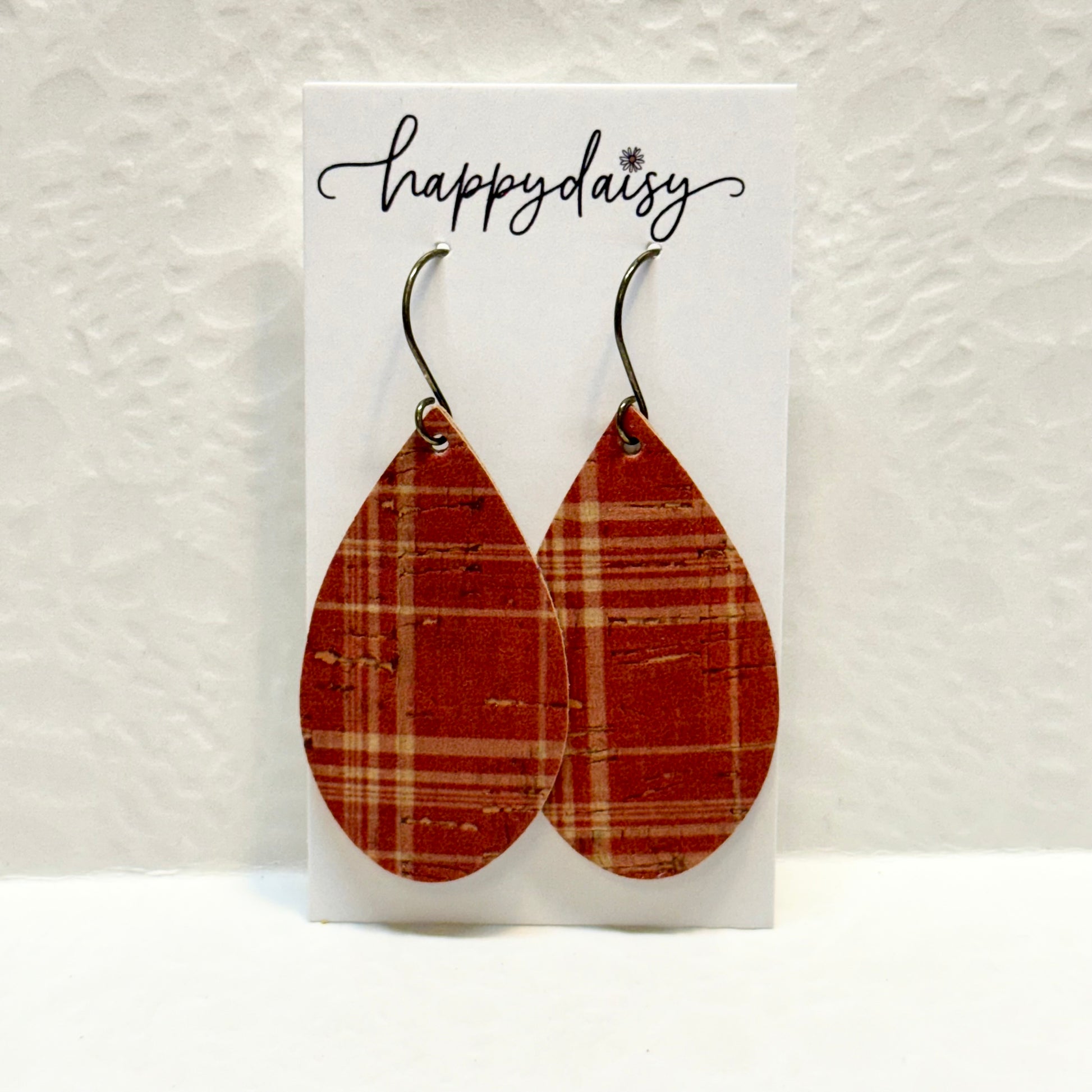 Fall Plaid Rust and Tan Cork on Leather Teardrop Earrings